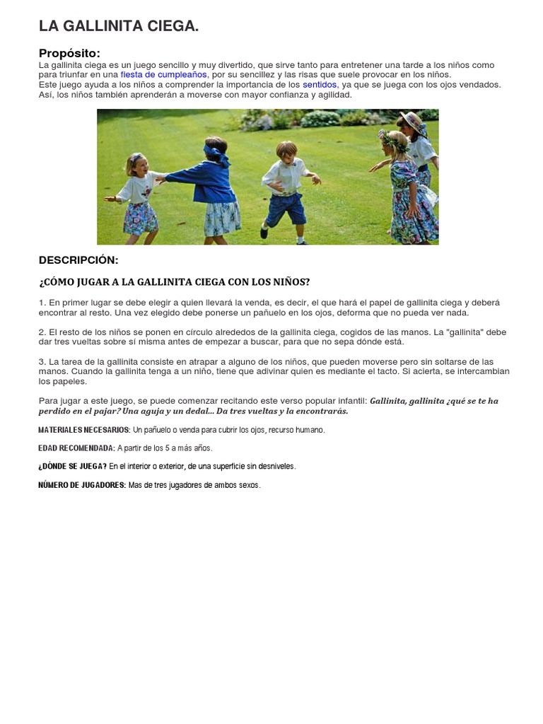 Alumnos de edades comprendidas entre los 8 y los 11 años. El guía debe dirigir a la manada hasta una meta que estar señalada, por un recorrido preparado previamente por el animador y que solo le dará a conocerá él. Debido a que el niño gallinita debe estar atento. Cuando los participantes saben el animal que les ha correspondido, recorren la habitación con los ojos vendados (para grupos mayores de 20 participantes esto no es necesario), imitándolo con la voz y los gestos. Objetivo general del juego la gallinita ciega / juego tradicional la gallina ciega / el jicotillo únicamente puede atrapar a doña blanca estando afuera del círculo, si regresa a él, ya no puede ser atrapada. Reglas del juego y objetivo que persigue. De vista nos ciega la vista hacia la manera de cómo los propios miembros y otros habían entendido el werkbund en los primeros años del siglo xx. Objetivo general identificar los juegos tradicionales del ecuador a su vez diseñar una guía para educadoras con el fin de incentivar a la practicar y enseñar juegos tradicionales a los niños y niñas.
